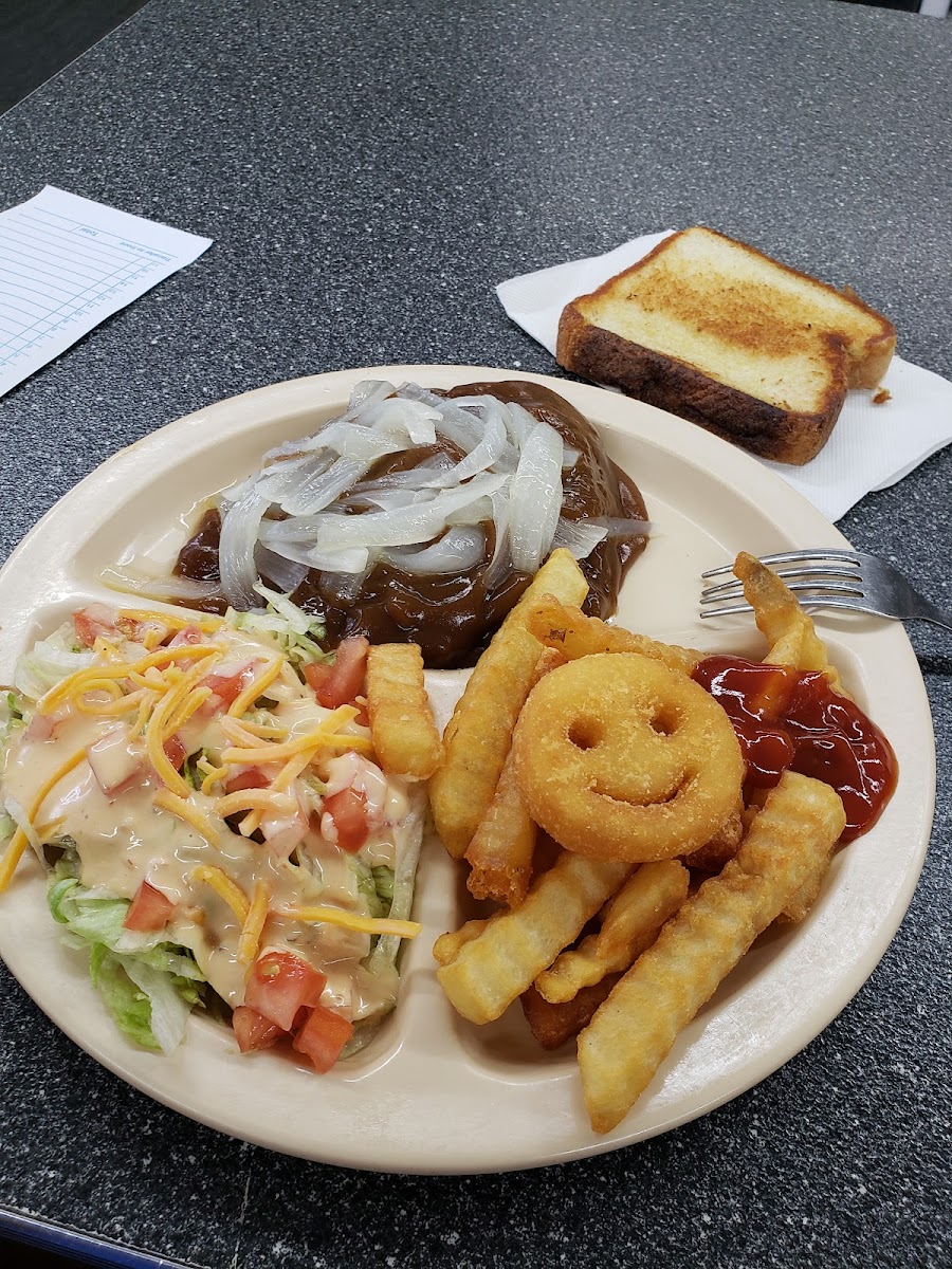 I had the plate lunch with a hamburger steak. It was absolutely delicious! It came with a salad, fries, hamburger steak (gravy & onions), german chocolate cake and a drink. Everything was great as well as cooked fresh to order. The price was fantastic for the amount of food I received, it was less than $8 if memory serves me correctly